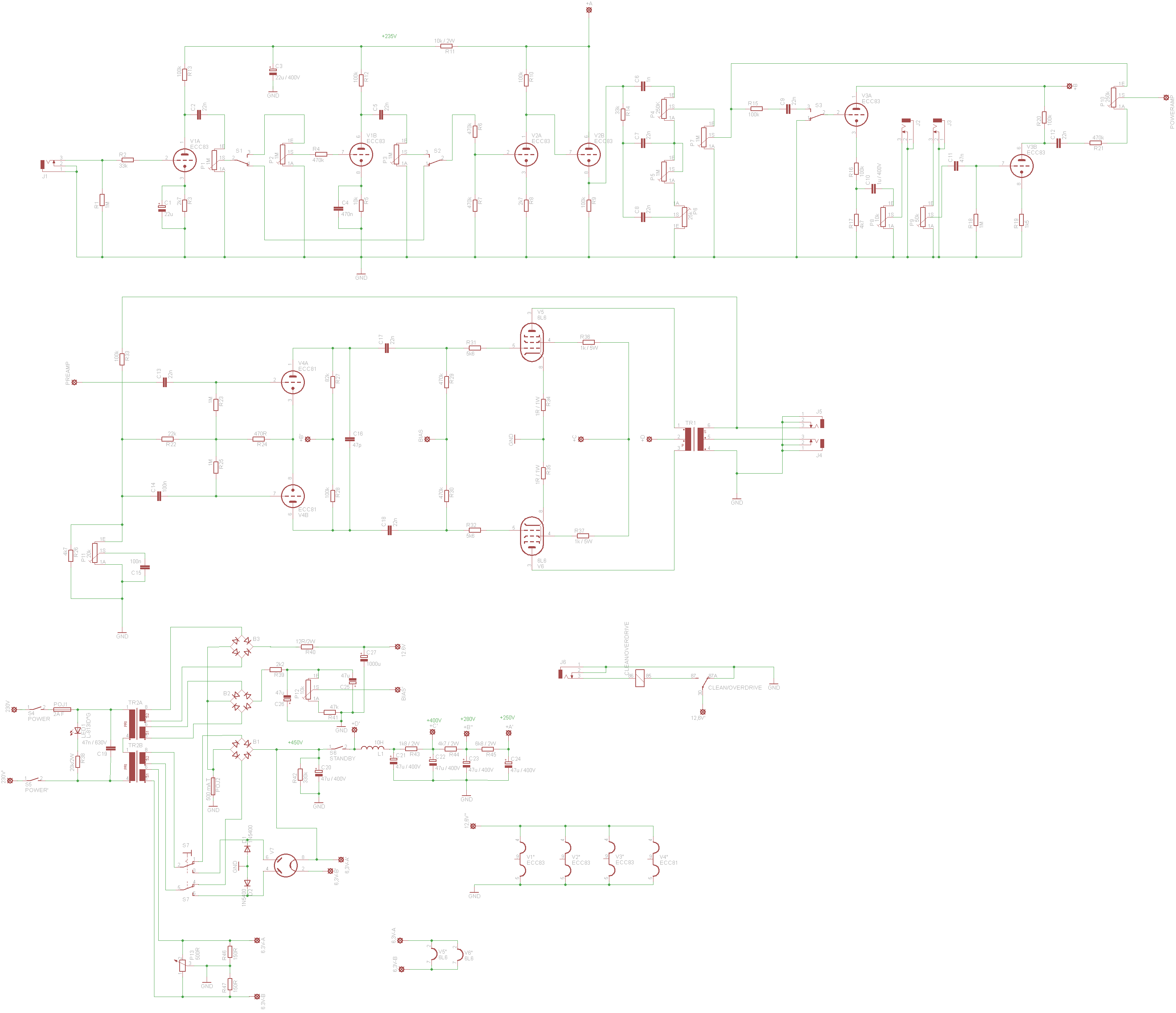 | dc.description.abstract | The objective of this bachelor’s thesis was to design a low-frequency tube amplifier optimized for use with electric guitar. The preamp is equipped with ECC83 triode tubes as voltage amplifier and cathode follower for connection with a simple frequency corrector. The output of the FX loop allows the connection of external effects. The power amplifier is realized by dual-action 6L6 tubes and phase invertor with ECC81 triode. Output transformer allows impedance matching for speakers. The power supply uses a GZ34 rectifier tube and diode bridges. Text of thesis also includes theoretical design of guitar tube amplifier and documentation of realization of functional prototype. | en |