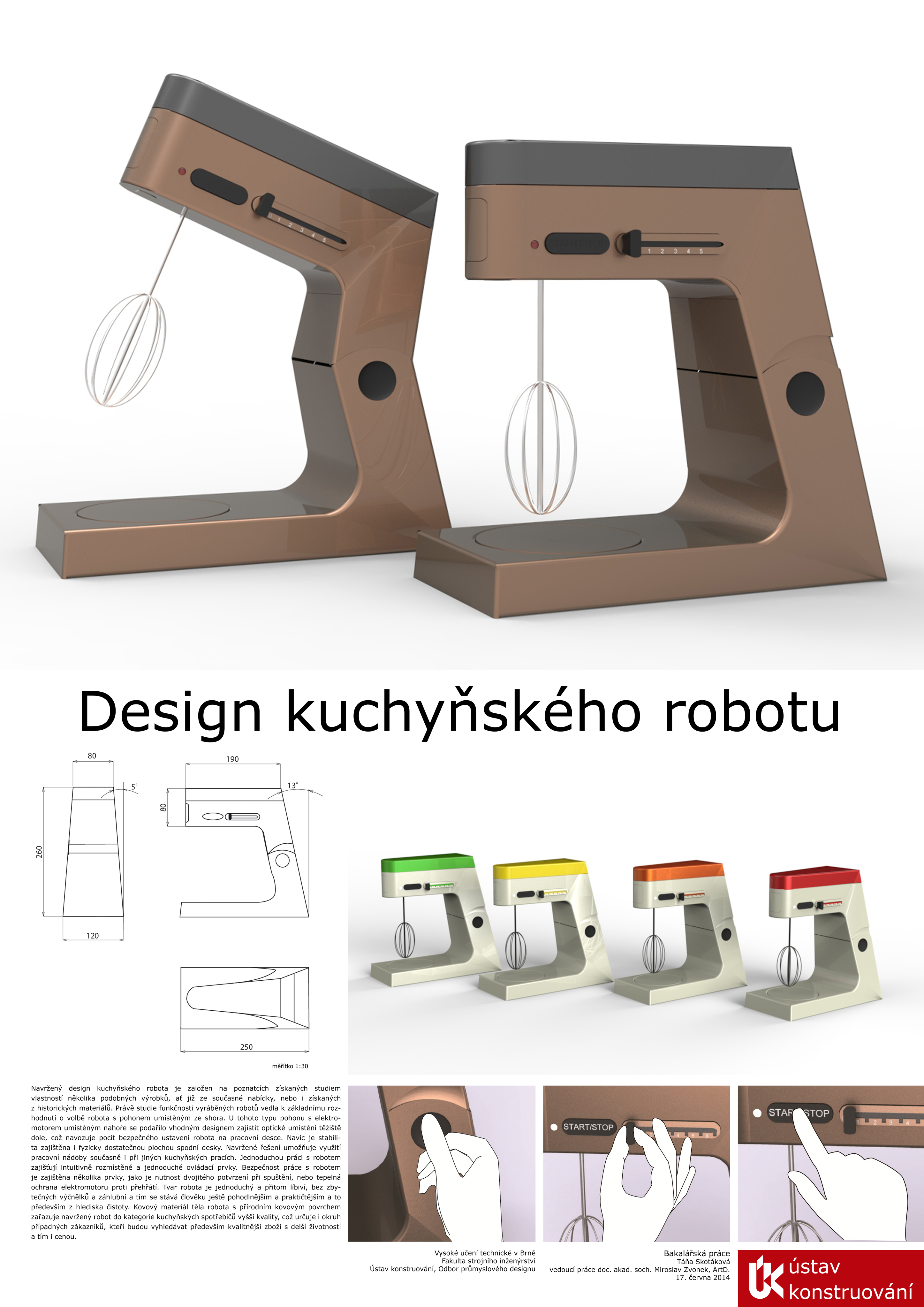 SKOTÁKOVÁ, T. Design kuchyňského robotu [online]. Brno: Vysoké učení technické v Brně. Fakulta strojního inženýrství. 2014.